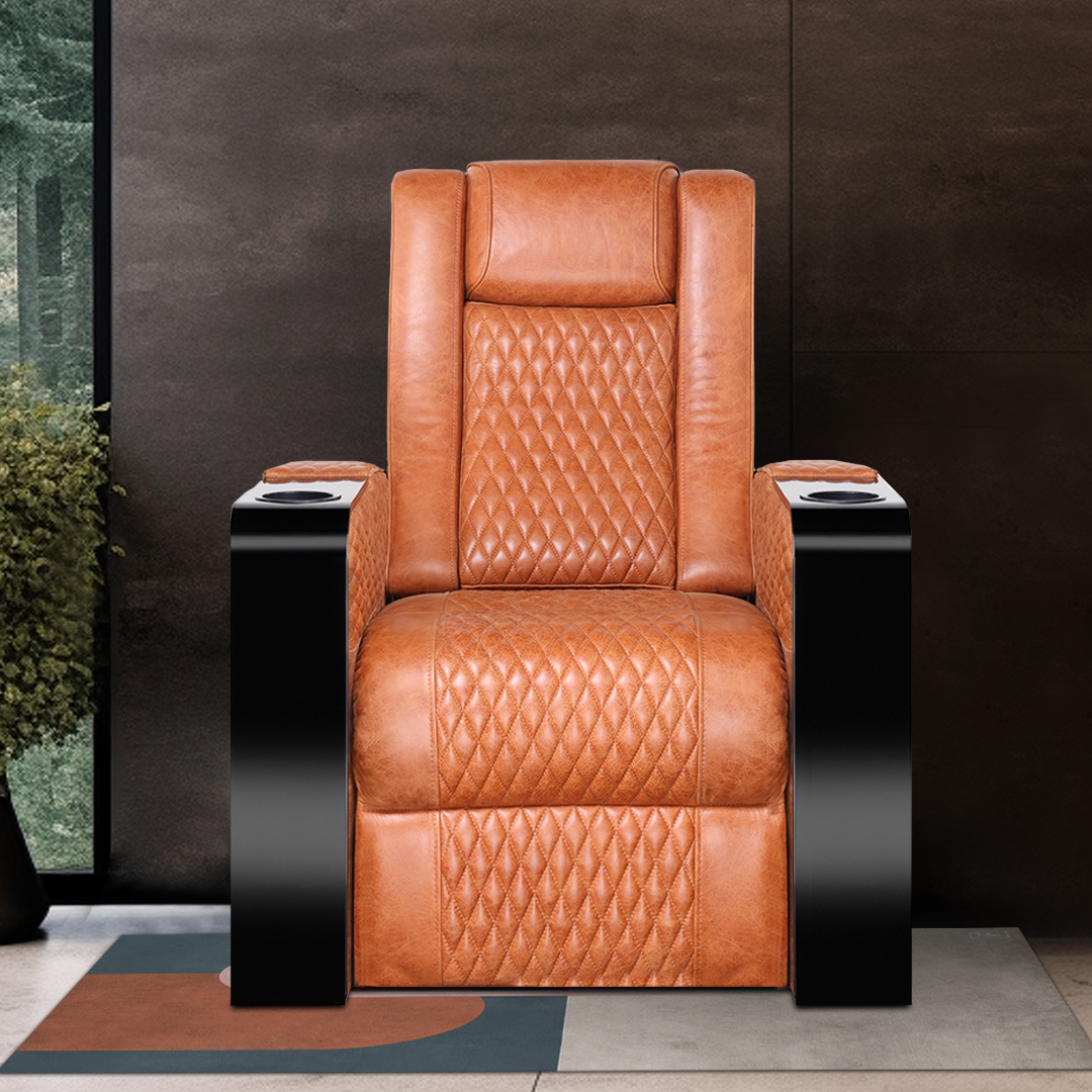 Home Theater Recliner Chair – Milano Plus from Recliners India is the ultimate blend of elegance, technology, and comfort. An upgraded version of the Milano model, it features premium Artificial Leather in a rich Brown color with exquisite diamond stitching on the backrest for a sophisticated touch. The advanced four-motor system allows independent adjustments for headrest, lumbar support, backrest, and footrest, ensuring a fully customized seating experience. A sleek touch panel offers effortless control, while the built-in cup holder and luxurious veneer wooden armrests add functionality and style. Perfect for high-end home theaters, Milano+ delivers unmatched luxury.