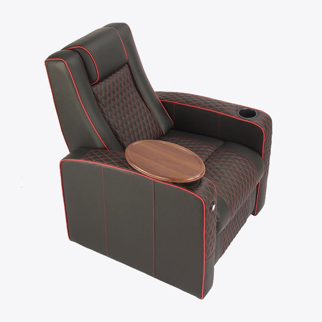 Home Theater Recliner Seat – Milano Black with Red Piping: Crafted with the highest level of craftsmanship, this ultra-luxury Milano home theater recliner is the perfect addition to any home theater room. It features a comfortable headrest reclining mechanism and a stylish design that will complement any decor. The red piping adds a touch of color and style, while the black upholstery is easy to clean and maintain. This home theater recliner is sure to become a favorite spot in your home. Choice of the capacitive touch panel, micro-adjustable neck support, and wireless call system is available.