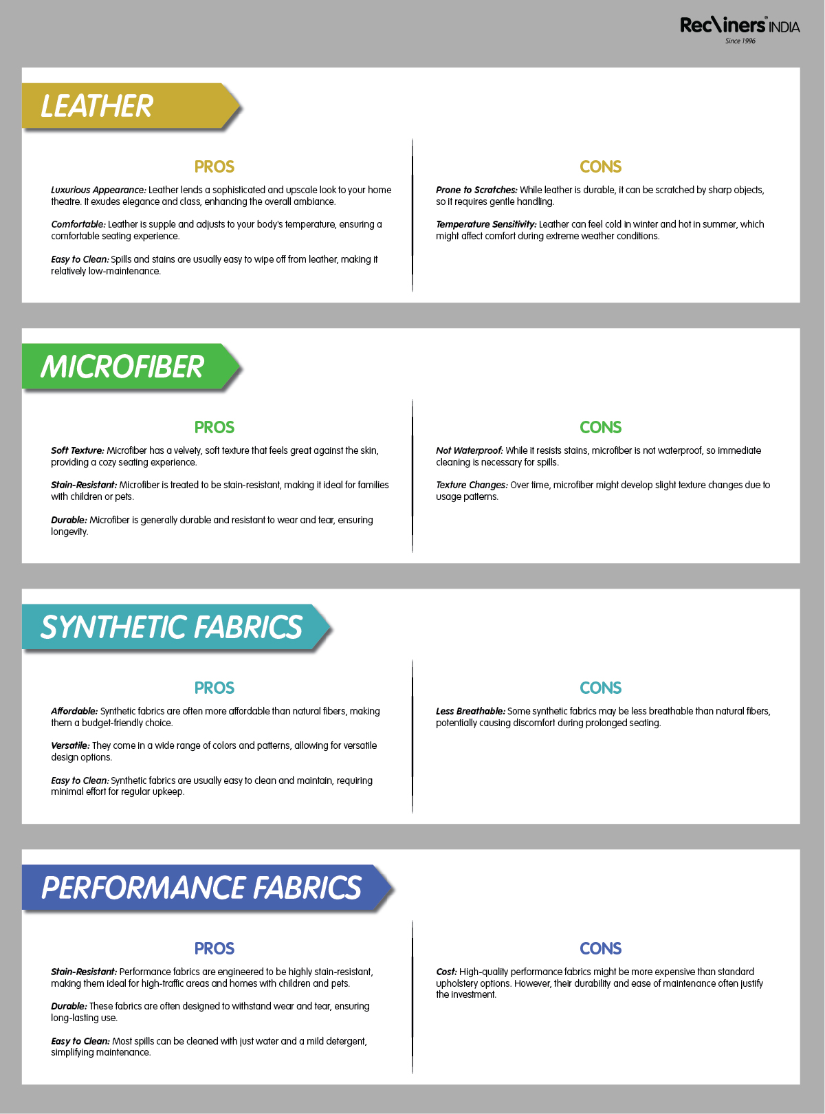 The choice of material can greatly influence the look, comfort, and durability of your home theater recliner: